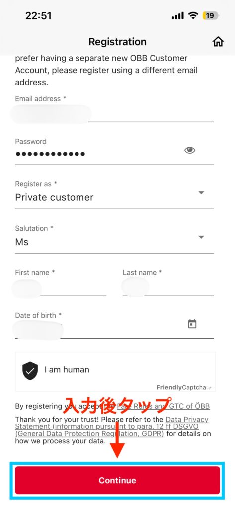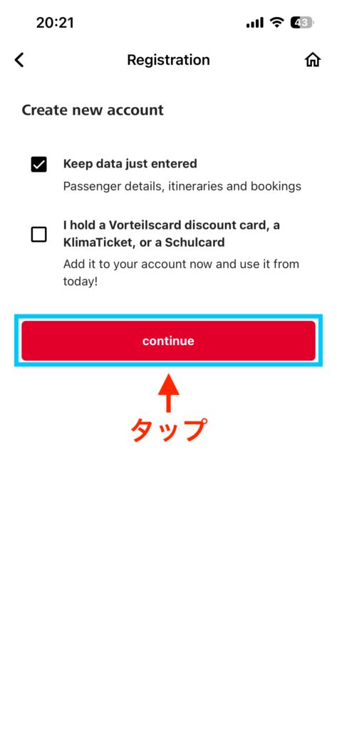 登録に必要な項目を入力します。完了したら「Continue」をタップします。