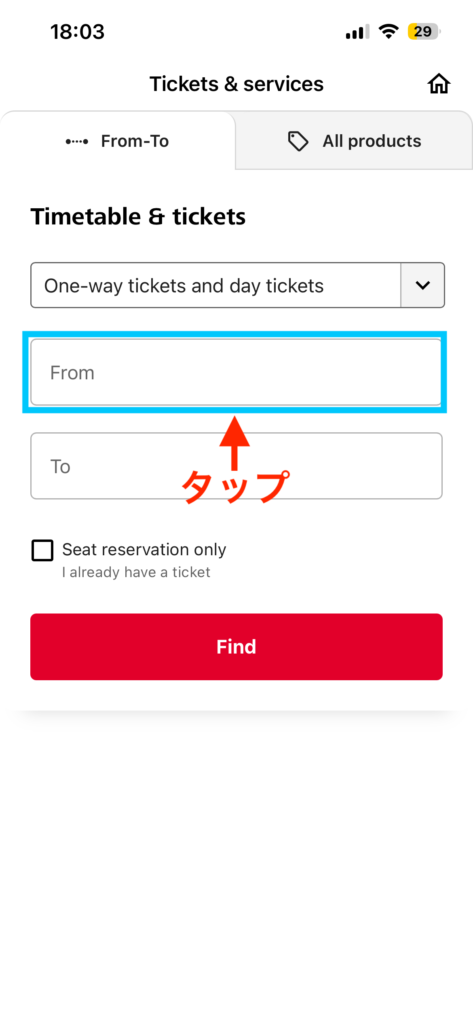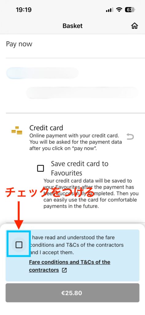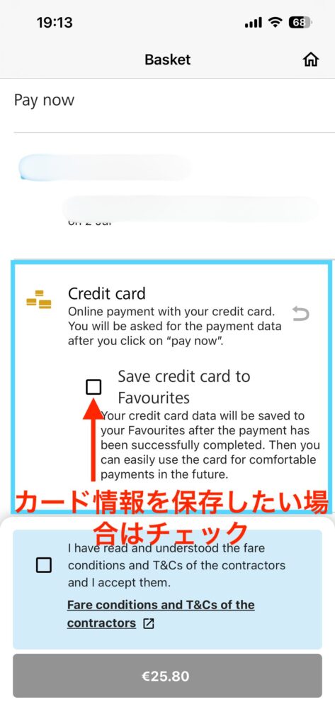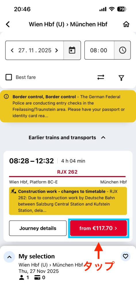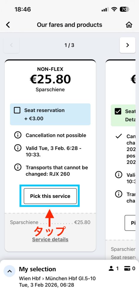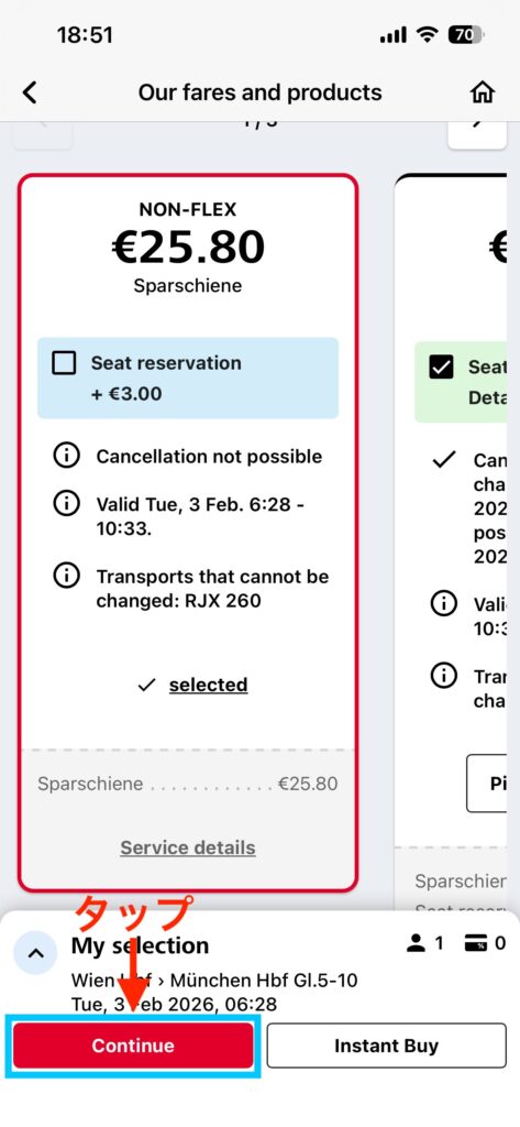 乗車したい列車が見つかったら「from € 〜」ボタンをタップしましょう。