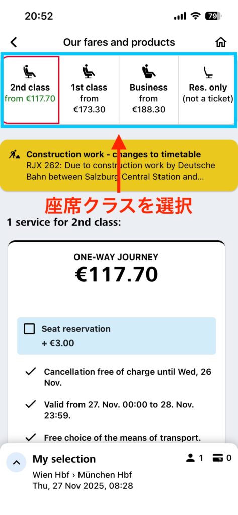 筆者は、DB Navigatorというドイツ国鉄のアプリから乗車チケットを予約し、座席の指定をÖBB ticketsアプリから行ったことがあります。