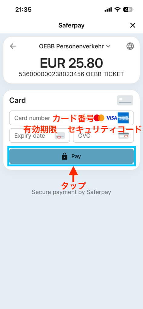 以下の情報を入力して「Pay」ボタンをタップします。