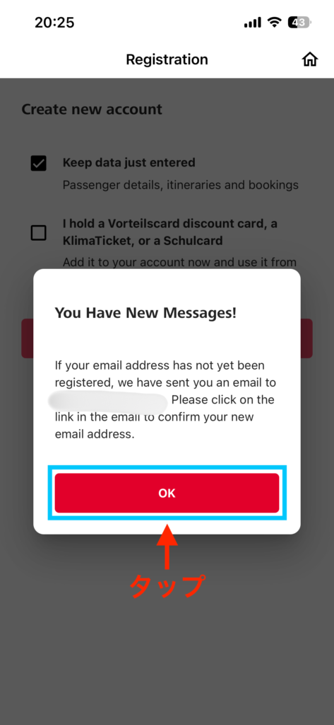 「OK」をタップしてメールボックスを確認しましょう。