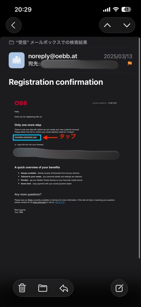 メールに記載されている「Complete registration now」をタップします。