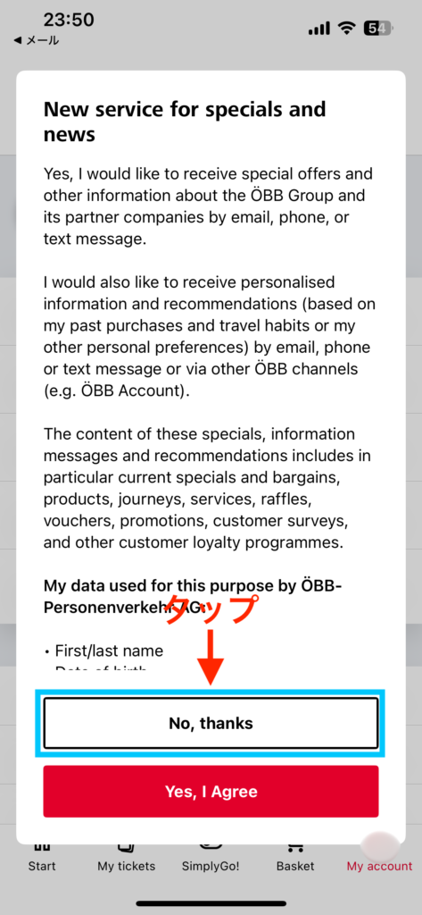 特別なオファーなどの情報を希望するかどうかの質問です。もちろん「Yes, I agree」を選択しても問題ありません。