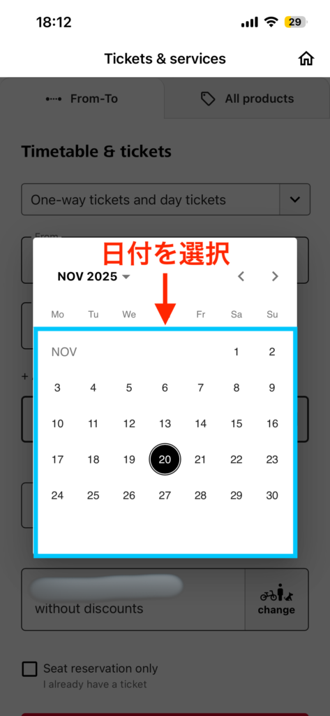 アイコンをタップして、カレンダーから乗車したい日付を選択します。