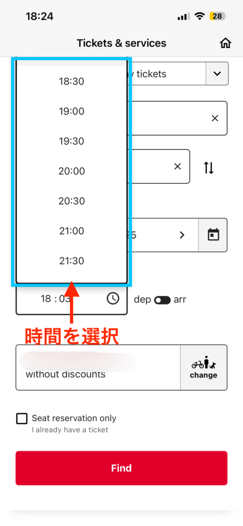 座席の予約のみを行いたい場合は、「Seat reservation only」にチェックをつけてください。