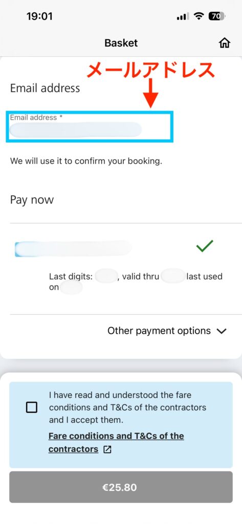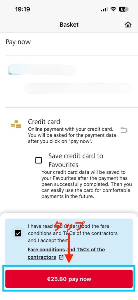 一番下にある赤いボタンをタップして、支払い情報の入力画面に進みます。