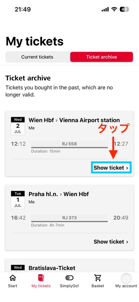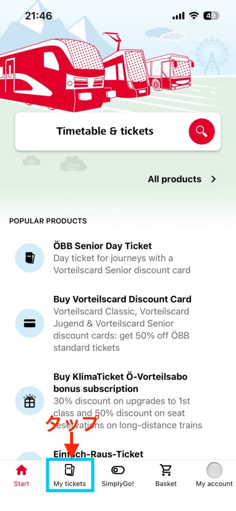 ÖBB Ticketsアプリでチケットを表示させる方法