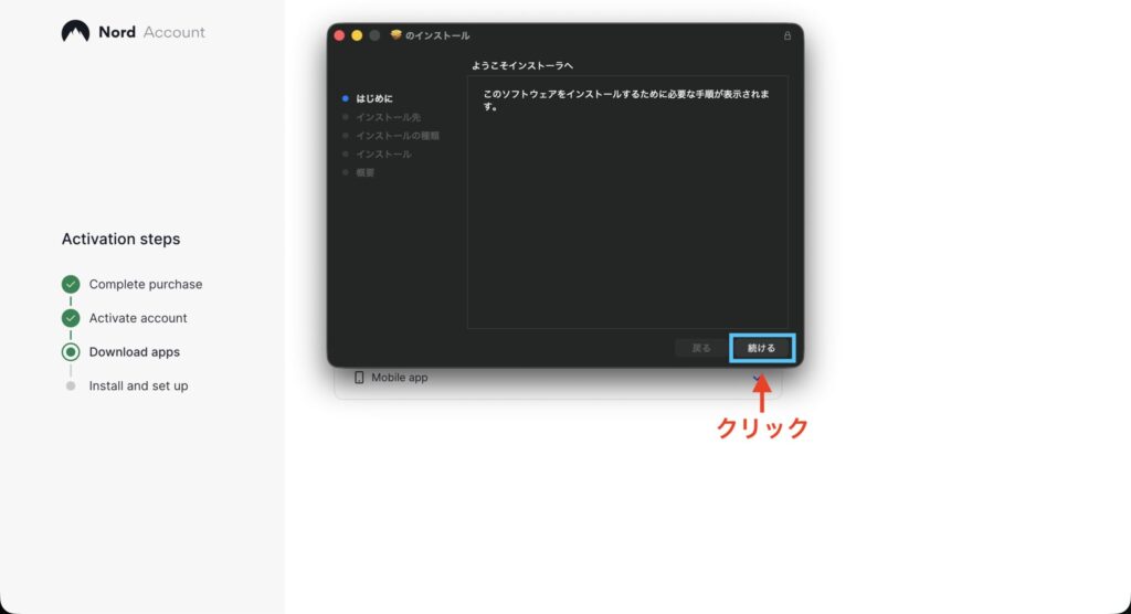 インストーラに従って「続ける」ボタンをクリックしていきます。