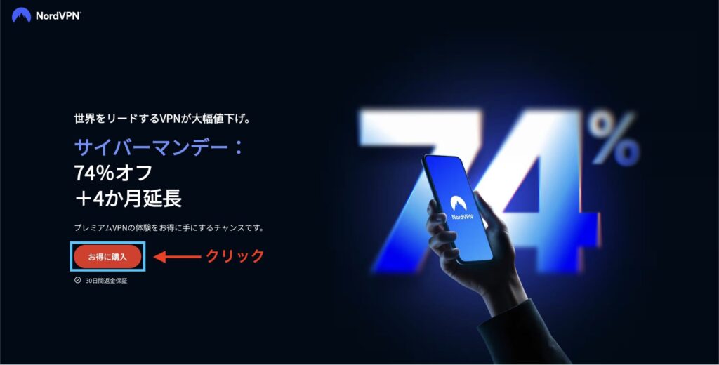 まずは、以下のNordVPN公式サイトにアクセスします。