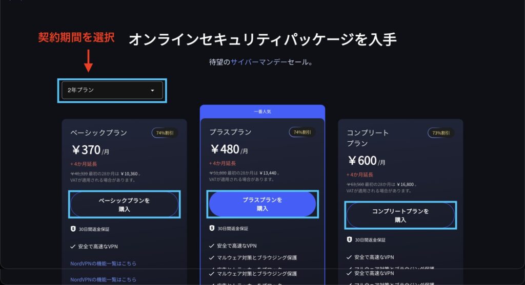 契約期間(1ヶ月、1年、2年)を選択して、お好みのプランの購入ボタンをクリックします。