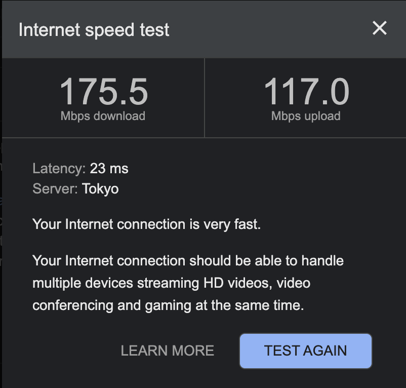 VPNなし(画像左)と比べると速度は落ちていますが、それでも動画視聴やオンラインゲームを複数のデバイスで快適に快適に楽しめる程度の速度が出ています。