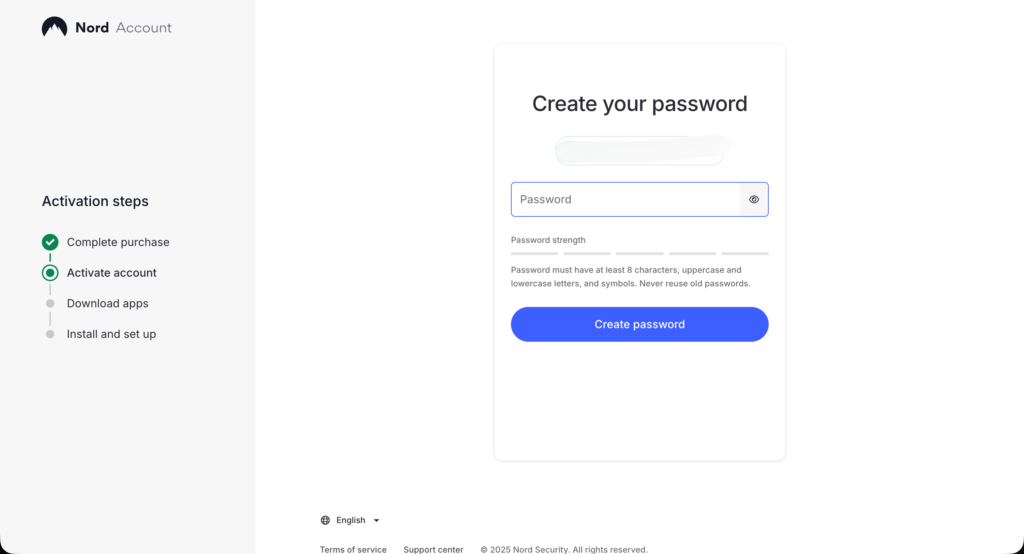 NordVPNアカウントにログインするためのパスワードを作成しましょう。