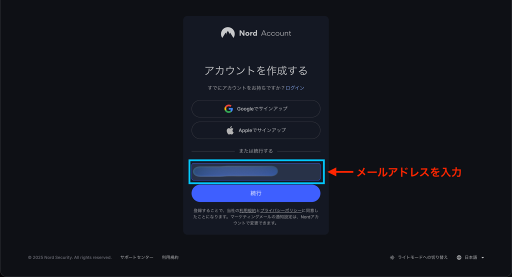 ここで入力したメールアドレスが「Nordアカウント」のメールアドレスになります。