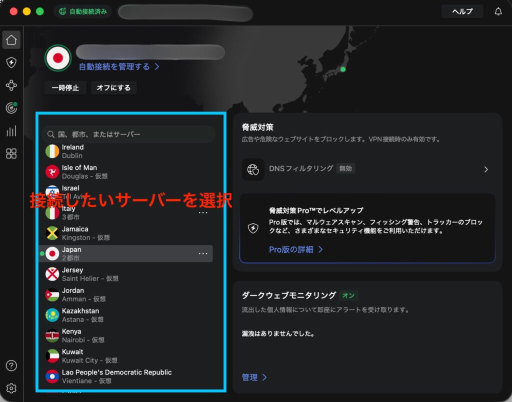 リストの中から接続したいサーバーを選択すると接続してくれます。