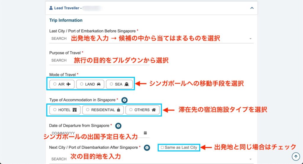 - Last City / Port of Embarkation Before Singapore:どの都市からシンガポールに到着予定かを入力 (JAPAN, TOKYO, TOKYOなど)