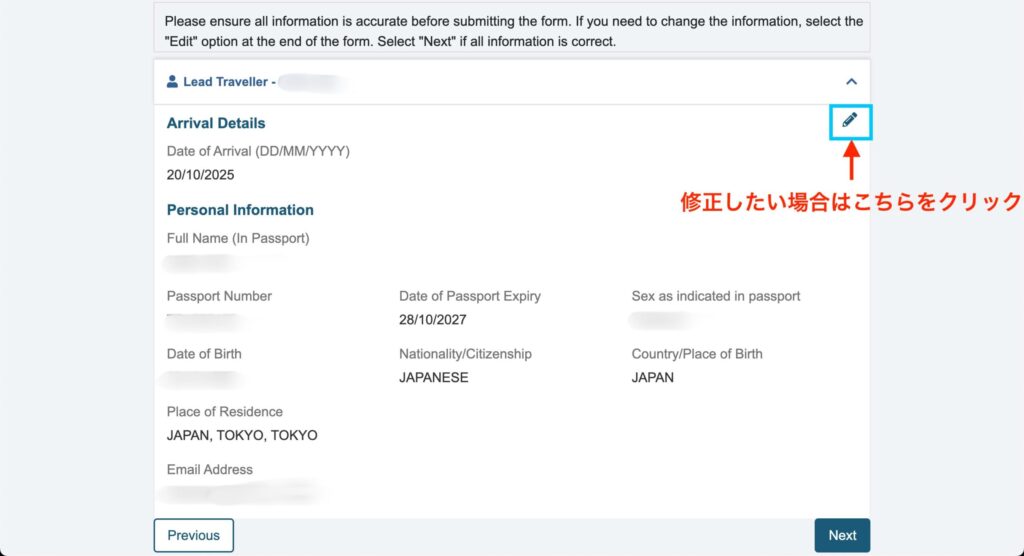 これまでに入力した旅行者情報や滞在情報などに間違えがないかを確認しましょう。