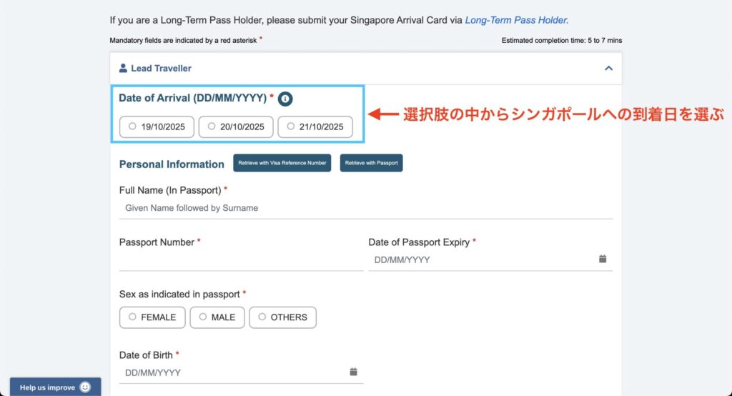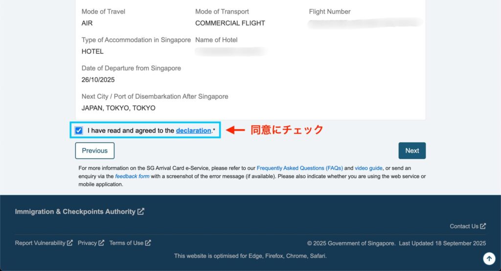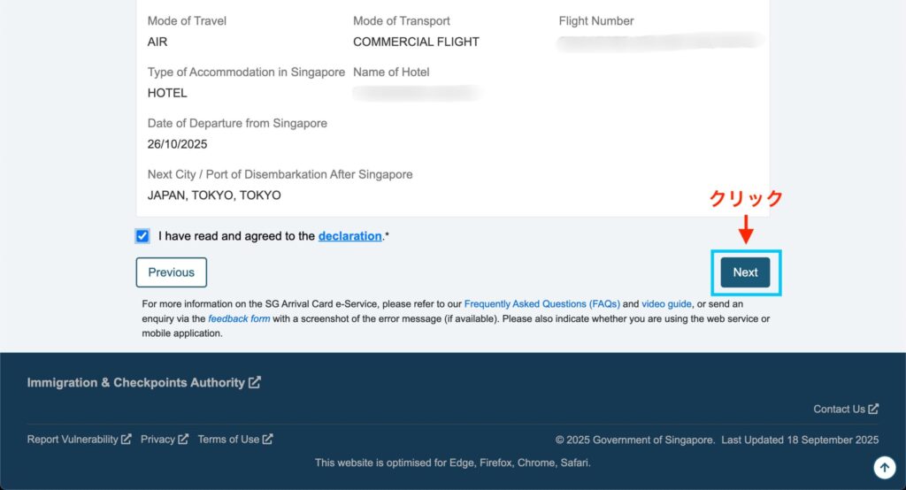 - Date of Departure from Singapore:シンガポールの出国予定日を入力 (カレンダーから選択可能)