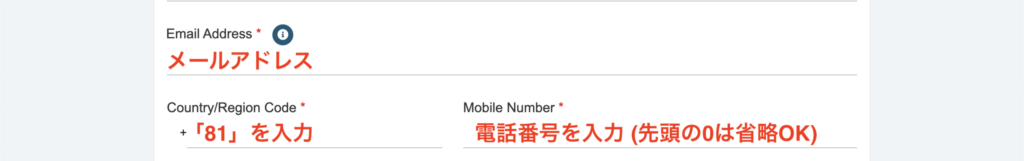 - Mobile Number:電話番号を入力 (先頭の0は省略してOK)