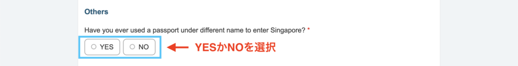 旧姓でシンガポールに滞在した経験があり、新姓でシンガポールへ入国しようとしている場合は「YES」になります。