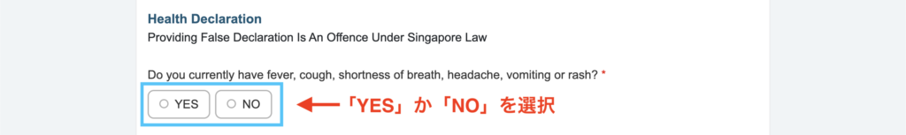 健康状態の申告について、以下に挙げられた症状があるかどうか「YES」か「NO」を選択しましょう。