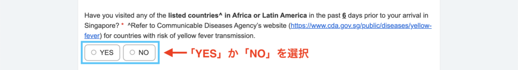 シンガポール到着前の6日間に、リストアップされているアフリカまたはラテンアメリカの国を訪問しましたか? 黄熱病の感染リスクのある国については、感染症庁のウェブサイト(https://www.cda.gov.sg/public/diseases/yellow-fever)をご覧ください。