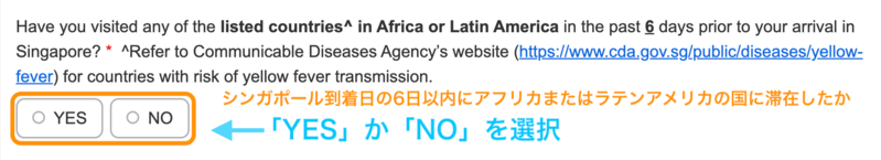 - シンガポール入国の6日以内に、リストにあるアフリカまたはラテンアメリカの国に滞在したか