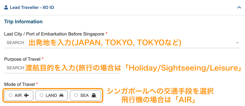 | Mode of Travel | シンガポールへの移動手段を選択。 飛行機の場合は「AIR」 |