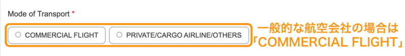 | Mode of Transport | 一般的な航空会社利用の場合は「COMMERCIAL FLIGHT」を選択 |