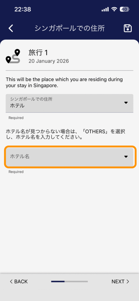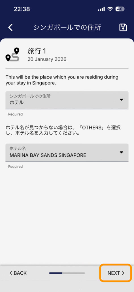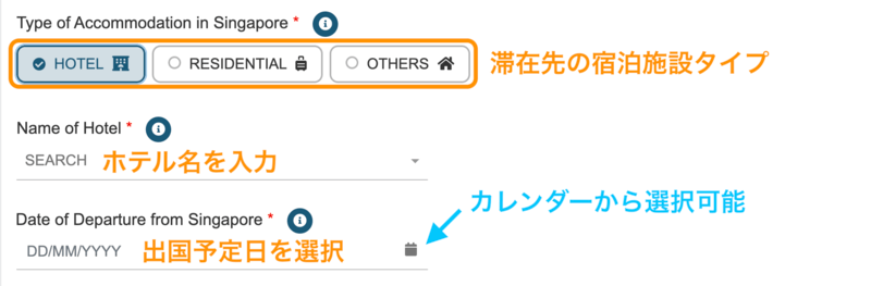 SG Arrival Cardの入力項目には、シンガポール国内の滞在先情報が含まれます。