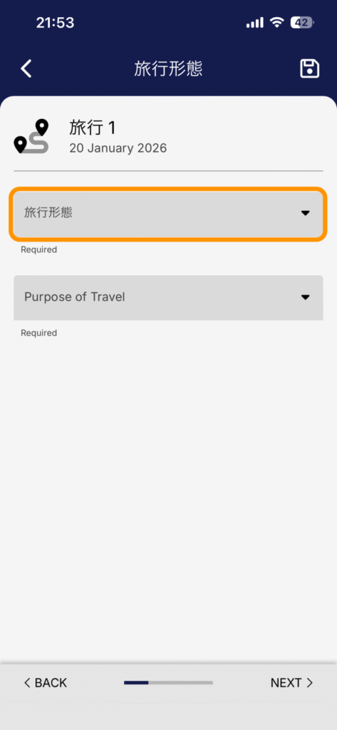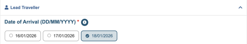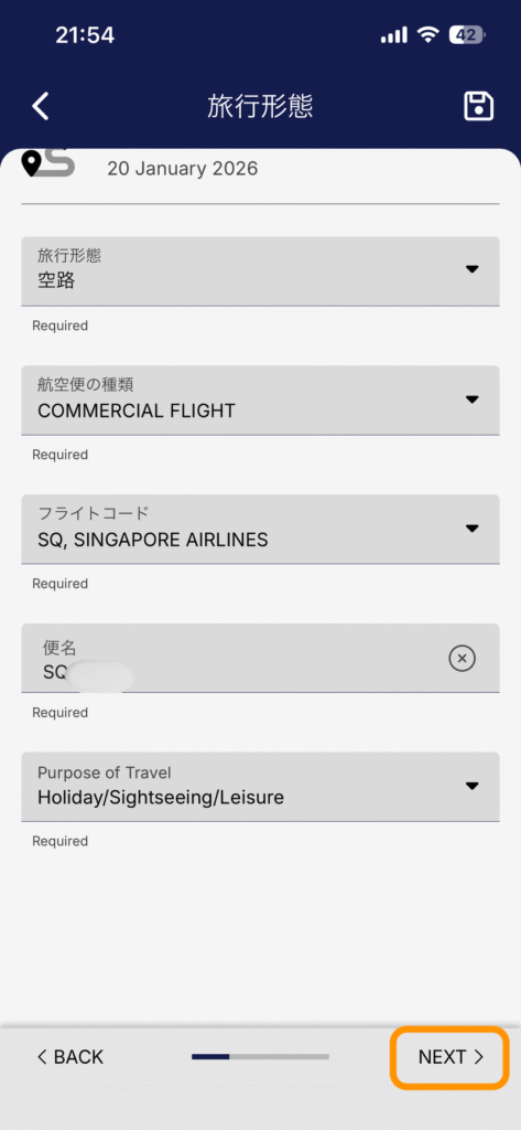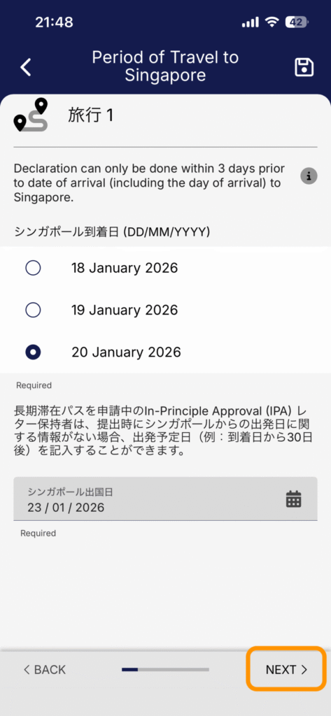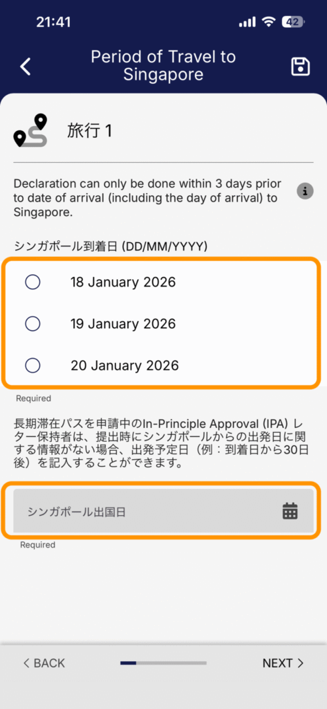 - シンガポール入国日(DD/MM/YYYY):選択肢の中から該当する日付をタップ