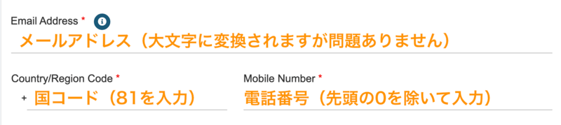 | Mobile Number | 電話番号を入力。先頭の「0」は省略 |