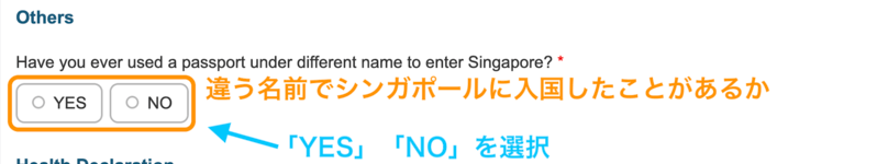 旧姓でシンガポールに滞在した経験があり、新姓でシンガポールへ入国しようとしている場合は「YES」を選択します。