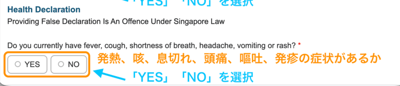 健康状態の申告について、以下に挙げられた症状があるかどうか「YES」か「NO」を選択します。
