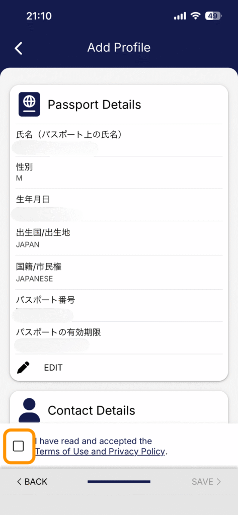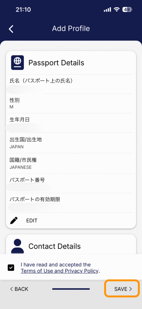 利用規約のチェックボックスにチェックを入れ、「SAVE」ボタンをタップしましょう。