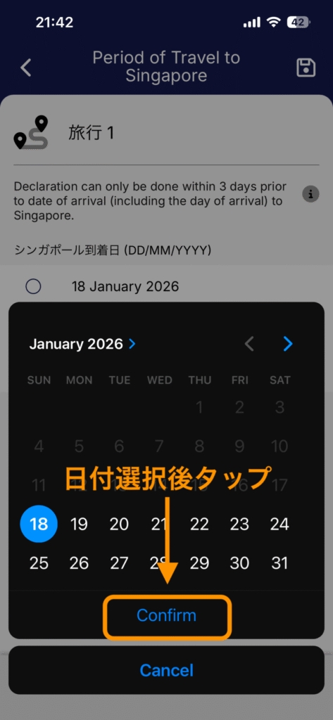 - シンガポール出国日:カレンダーから日付を選択後「Confirm」をタップ