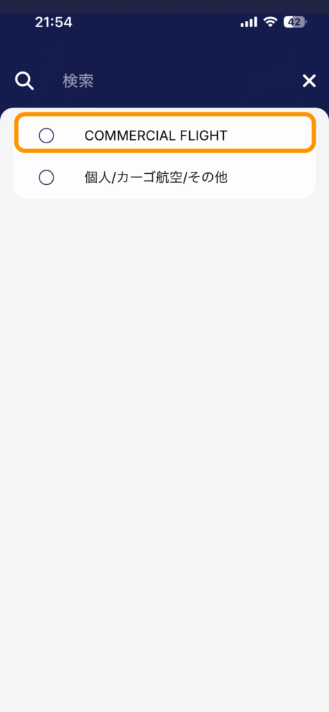 一般的な航空会社を利用する場合は、「COMMERCIAL FLIGHT」を選択しましょう。