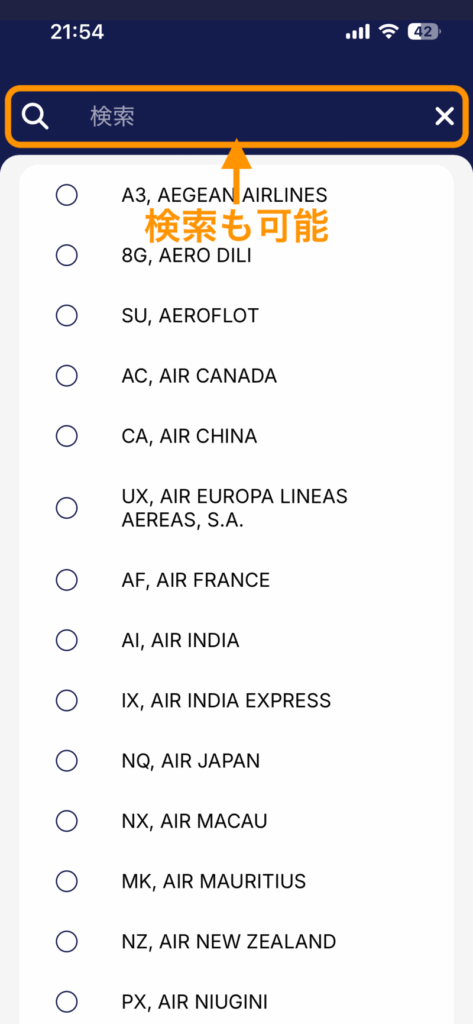 タップした先の画面で航空会社を選択しましょう。