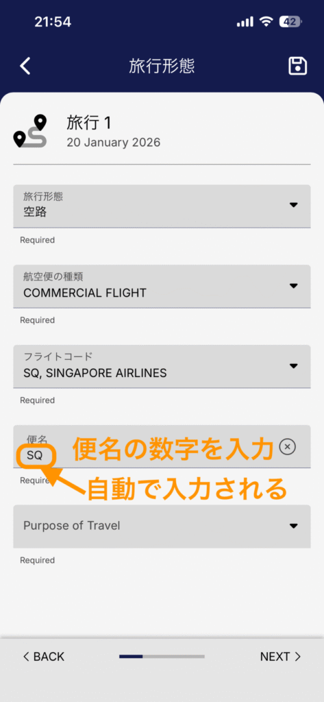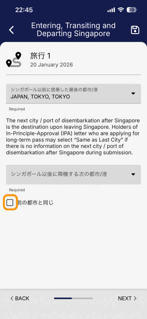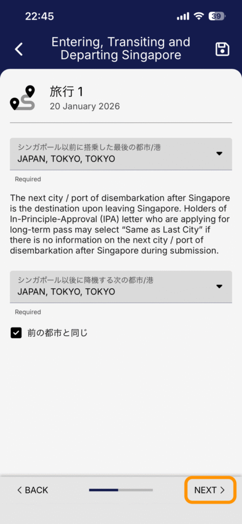 シンガポール渡航前の出発地や、シンガポール出国後の目的地に関する情報を入力していきます。