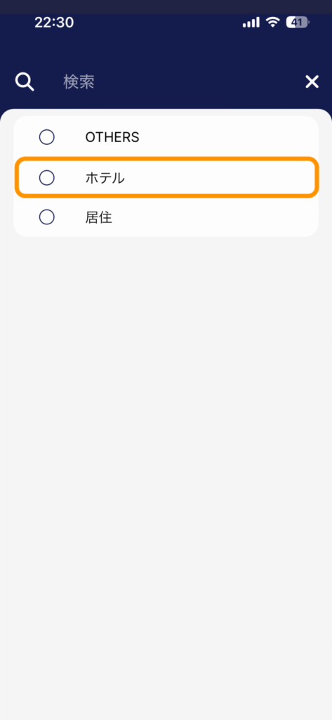 OTHERS/ホテル/居住の選択肢の中から選びます。