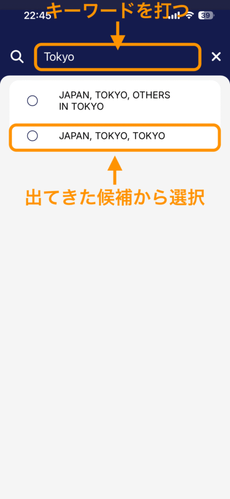 選択画面の検索ボックスにキーワードを打ち込むと、候補が出てきます(画像は東京の例)。