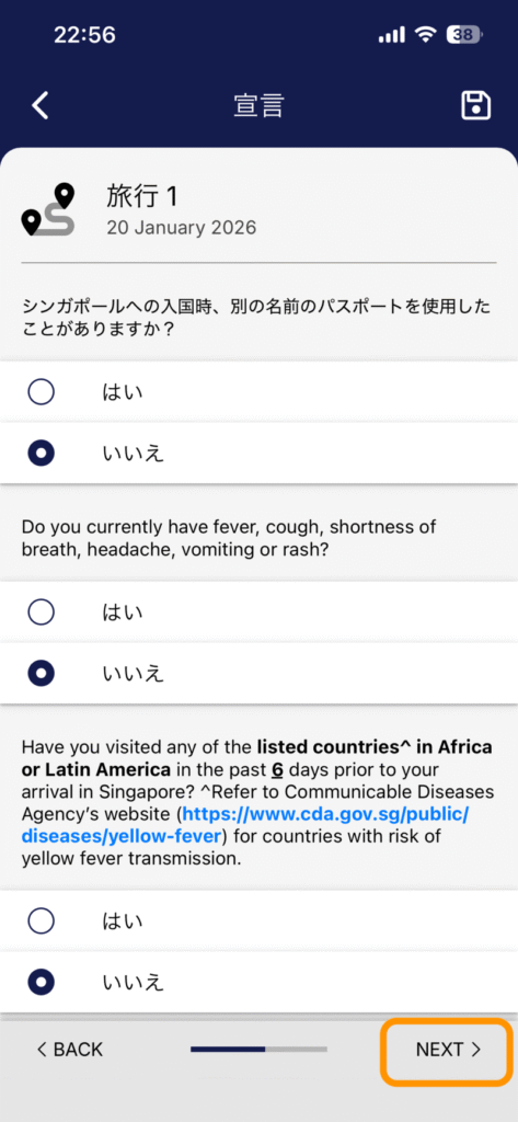 ここでは、シンガポール入国にあたっての質問に回答する必要があります。