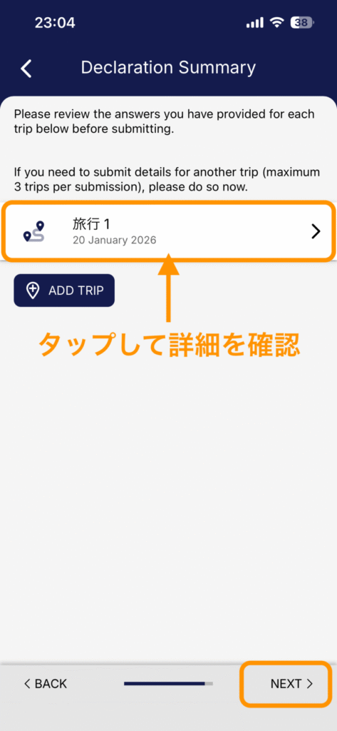 健康状態の申告が全て終わったら、画面右下の「Next」をクリックして先へ進みます。