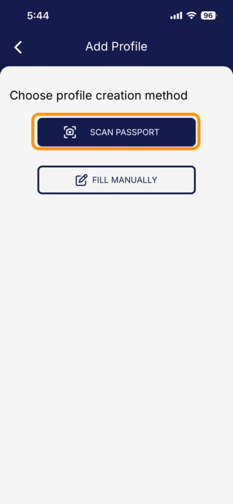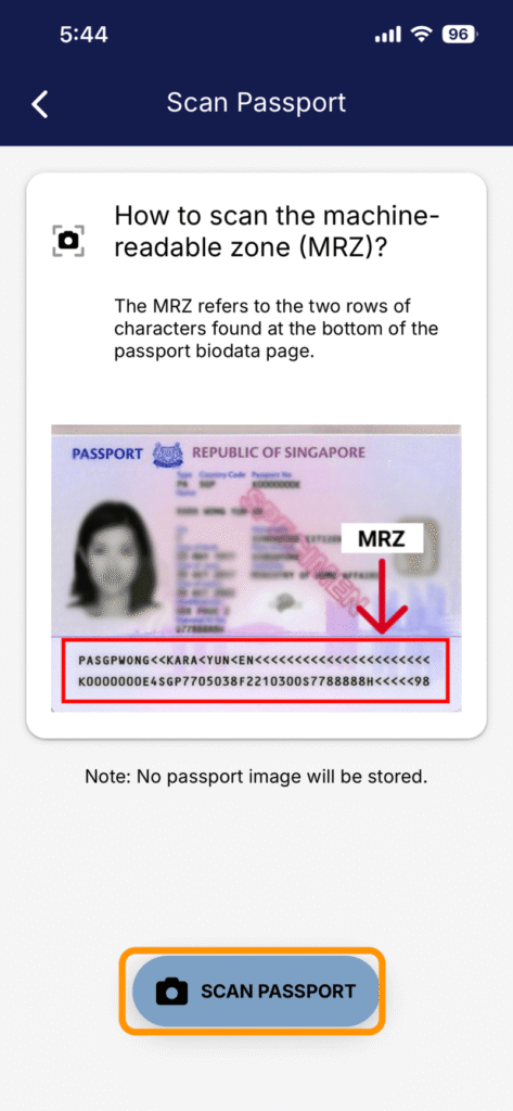 パスポートの読み取り方についての説明画面を確認し、「SCAN PASSPORT」をタップします。