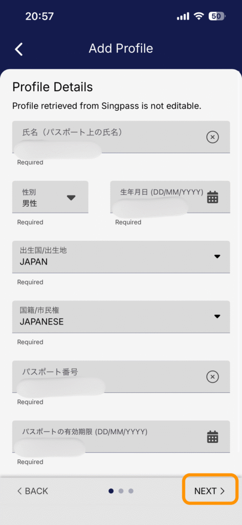 全ての項目の入力が済んだら「NEXT」をタップして先へ進みます。